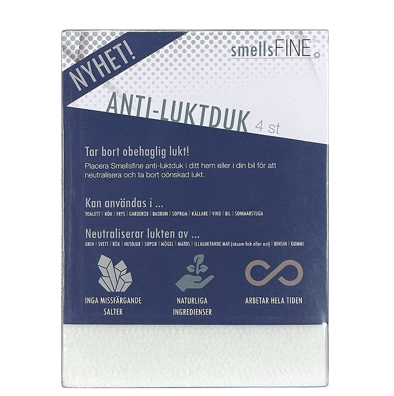 Afmetingen (per doek): 150x200x9mm. Inhoud: Amorf siliciumdioxide (silicium is het meest voorkomende mineraal in de natuur en komt voor in bijvoorbeeld zand en klei), water en bevochtigingsmiddel op naaldvilt (ecogecertificeerde impregnering). Smellsfine wordt in Zweden geproduceerd en is milieugecertificeerd volgens Bluesign en Oeko-Tex.
