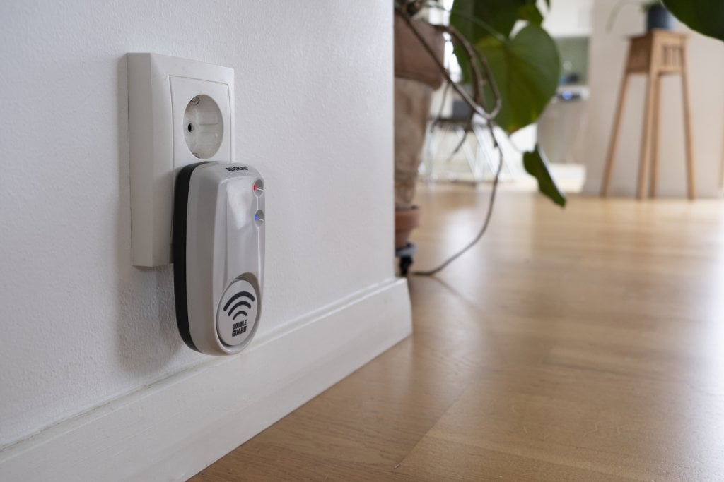 De afschriker zendt een geavanceerd ultrasoon geluid (A-Guard®) uit met aangepaste frequenties en een wisselende geluidsdruk die de muizen en ratten afschrikt. Werkt op een oppervlak van ca. 80 m2.